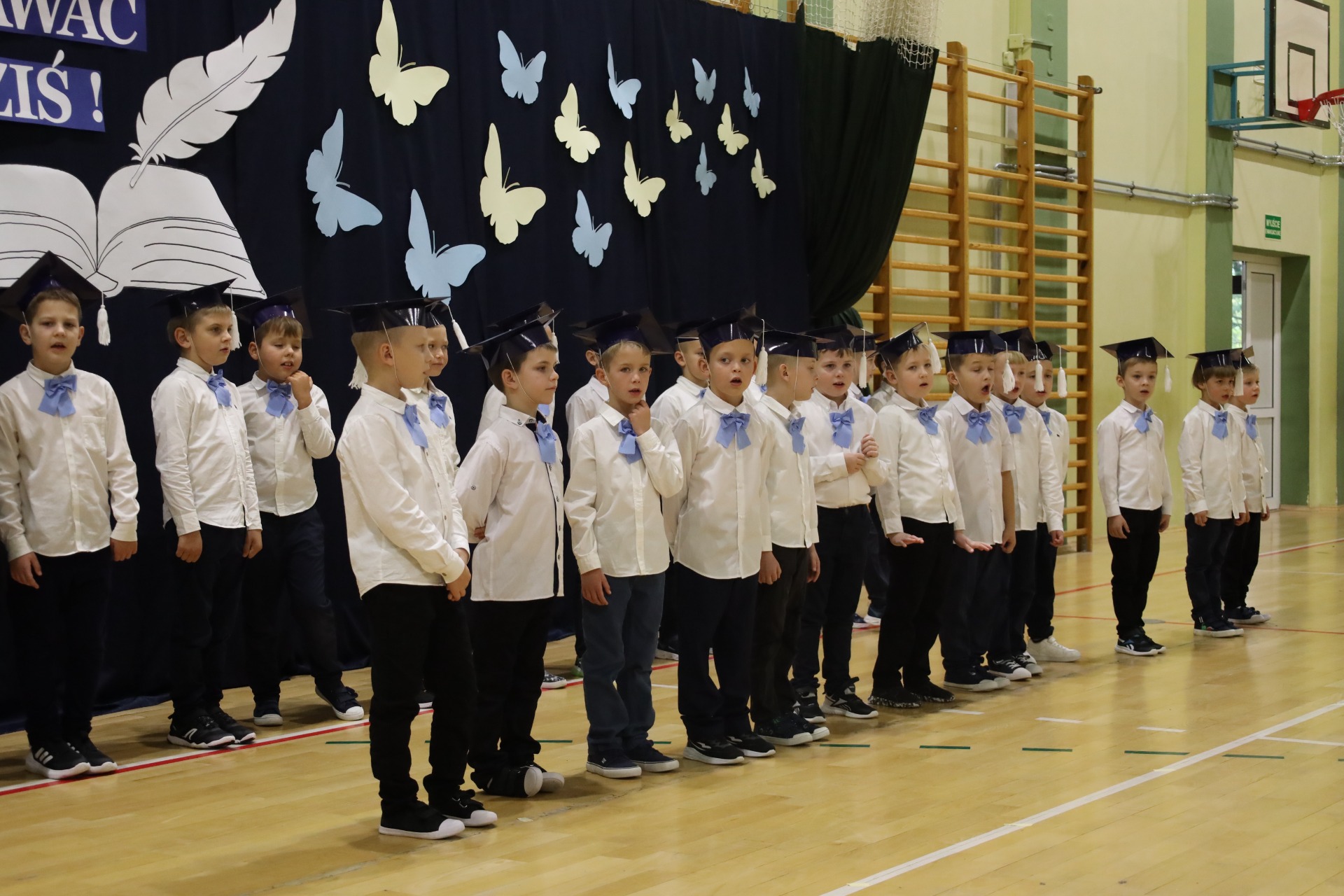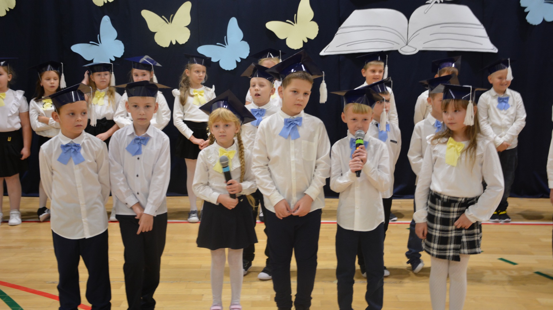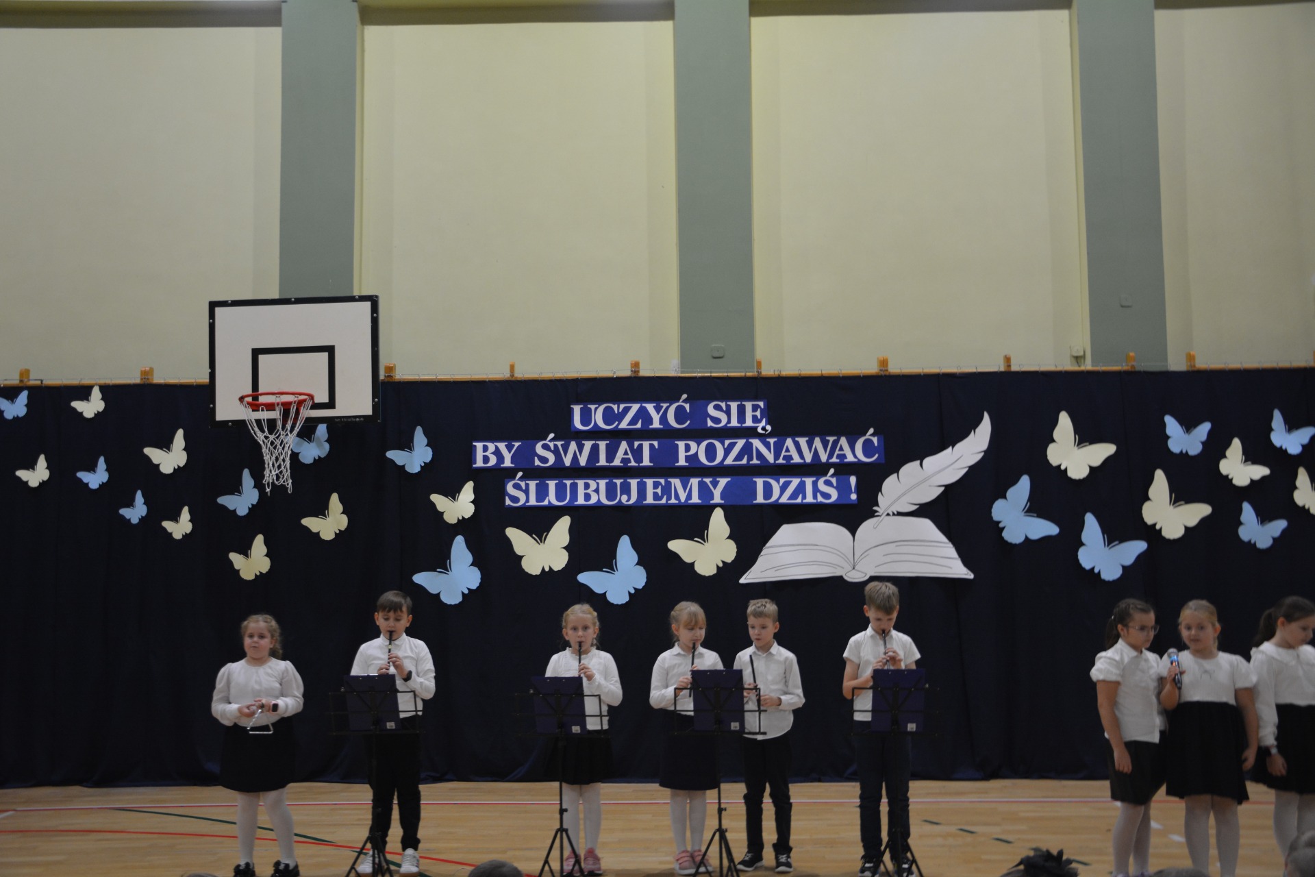 Pierwszoklasiści przedstawili piękny program artystyczny, w którym nie zabrakło piosenek, wierszy i wzruszających momentów. Występ uświetnili również uczniowie klas drugich – recytacją i śpiewem oraz grą na flażoletach w wykonaniu zespołu Fifulki. Za swój występ wszyscy artyści zostali nagrodzeni gromkimi brawami.
