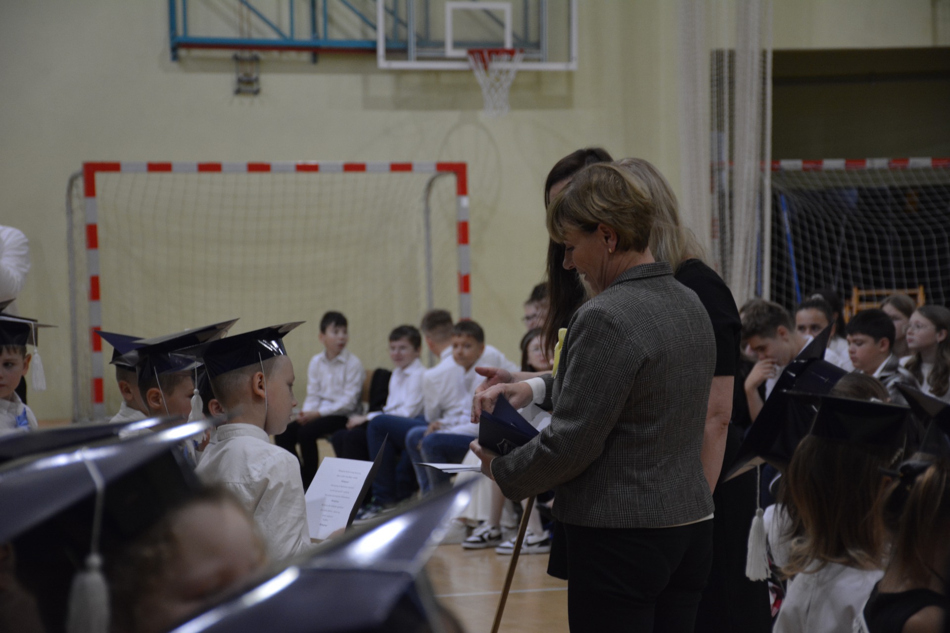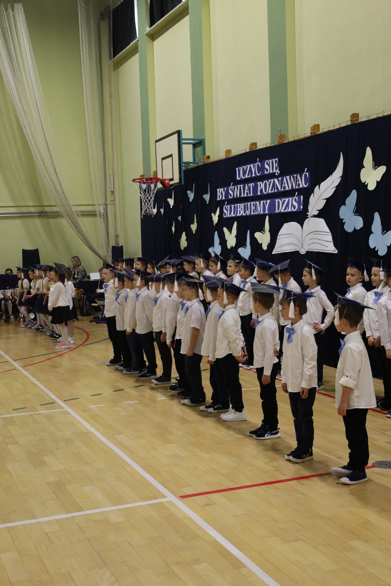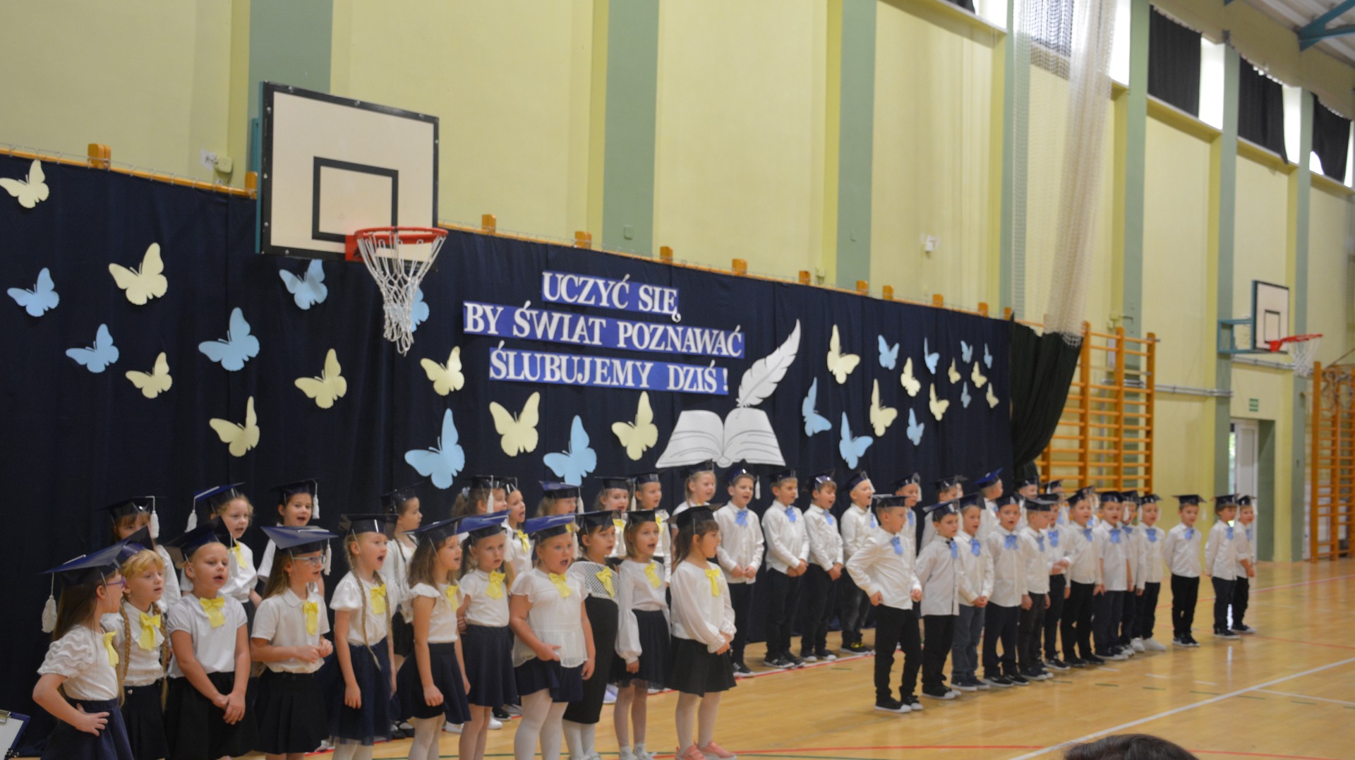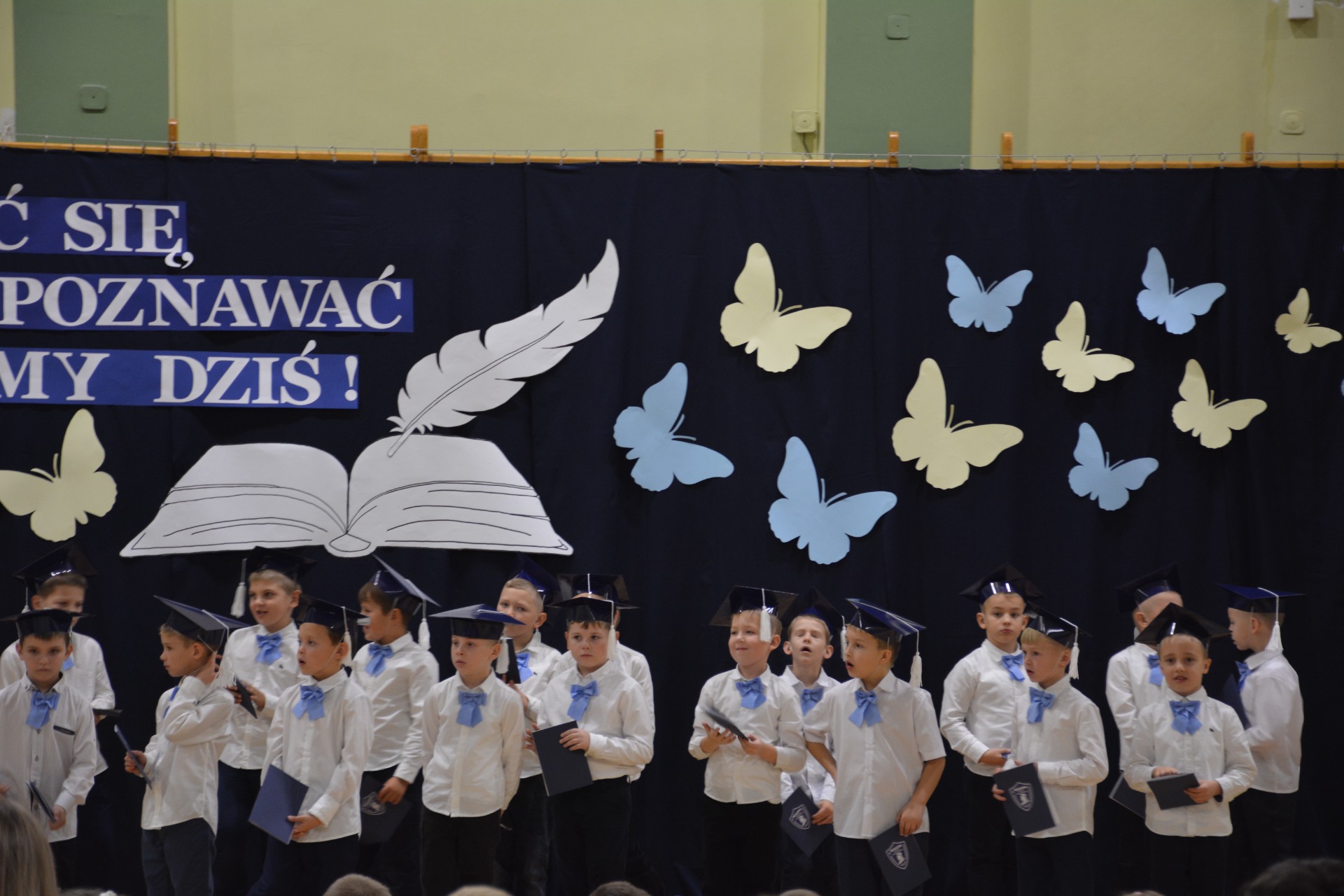 Pierwszoklasiści przedstawili piękny program artystyczny, w którym nie zabrakło piosenek, wierszy i wzruszających momentów. Występ uświetnili również uczniowie klas drugich – recytacją i śpiewem oraz grą na flażoletach w wykonaniu zespołu Fifulki. Za swój występ wszyscy artyści zostali nagrodzeni gromkimi brawami.