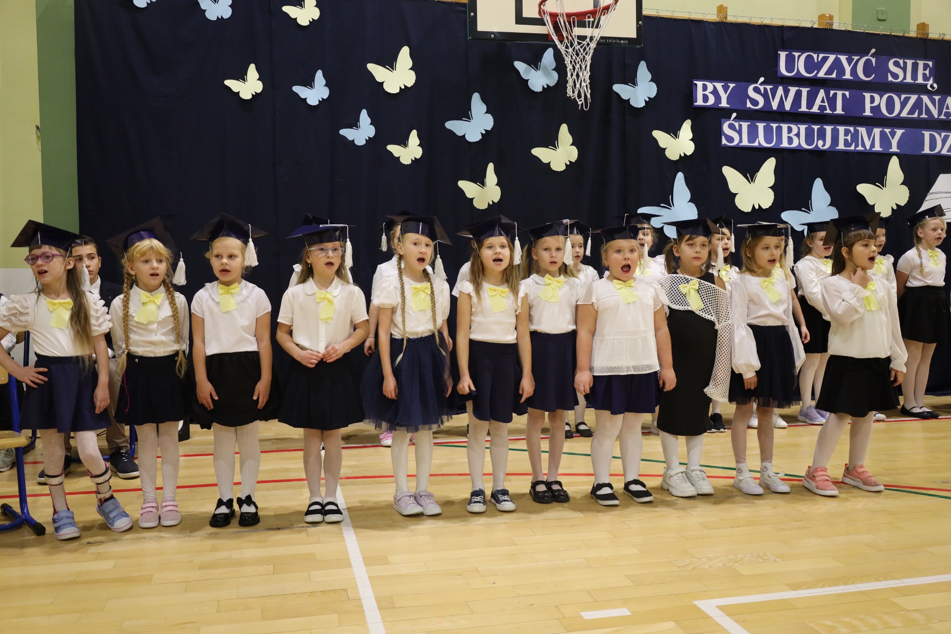 Dzieci pięknie prezentowały się w granatowych biretach oraz wstążeczkach nawiązujących kolorem do barw motyli – motywu przewodniego dekoracji.