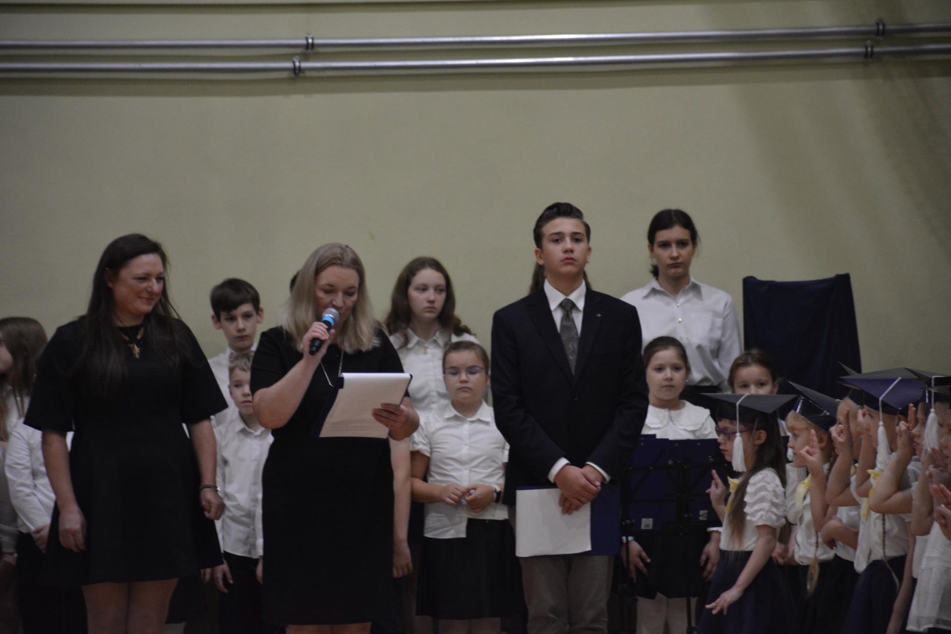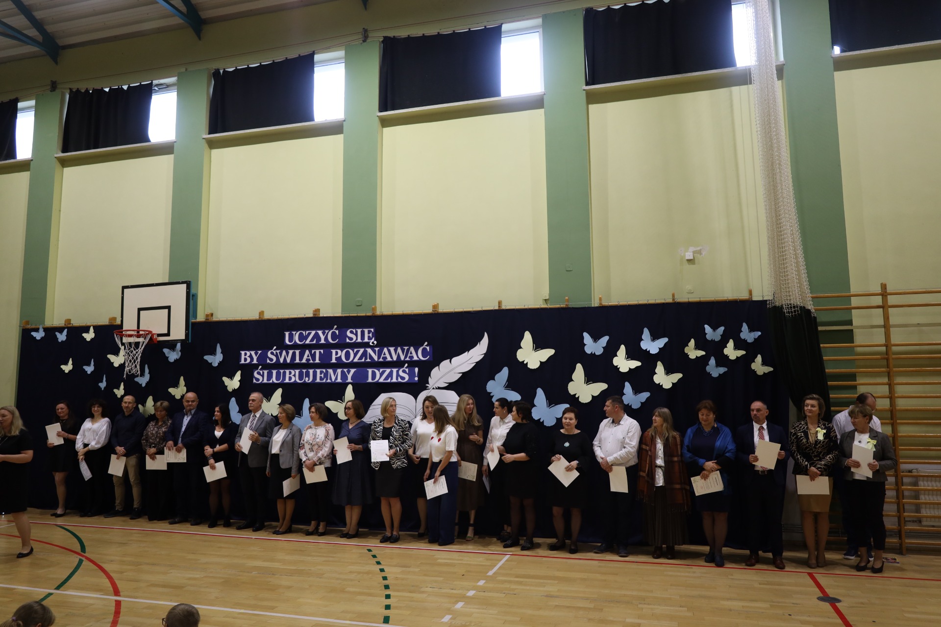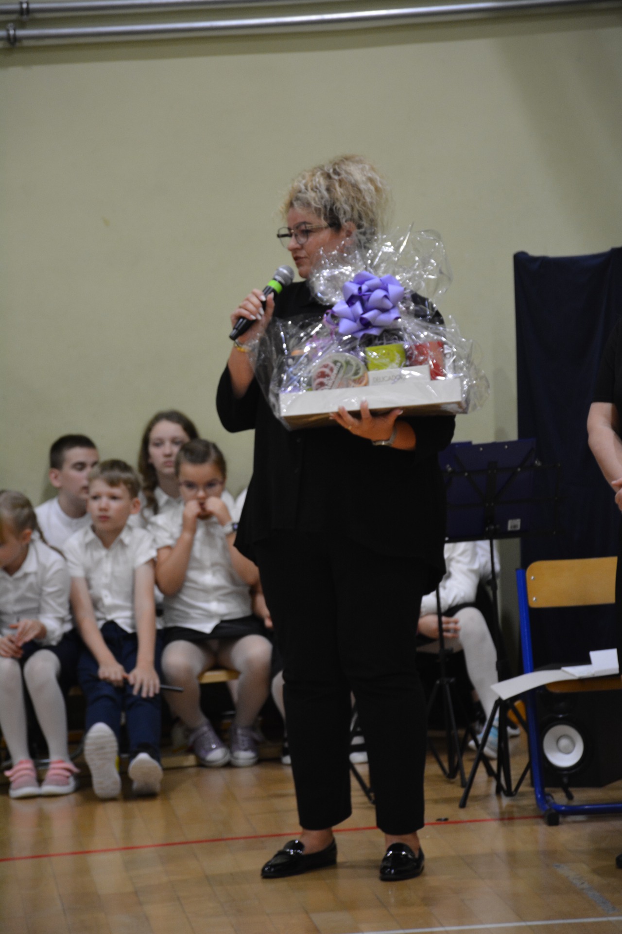 Na zakończenie uroczystości, w muzycznym akcencie z okazji Dnia Edukacji Narodowej, szkolny chór zaśpiewał piosenkę „Tyle słońca w całym mieście”, a pani dyrektor wręczyła nauczycielom i pracownikom szkoły podziękowania za cierpliwość, wyrozumiałość oraz zaangażowanie w codzienną pracę i edukację.