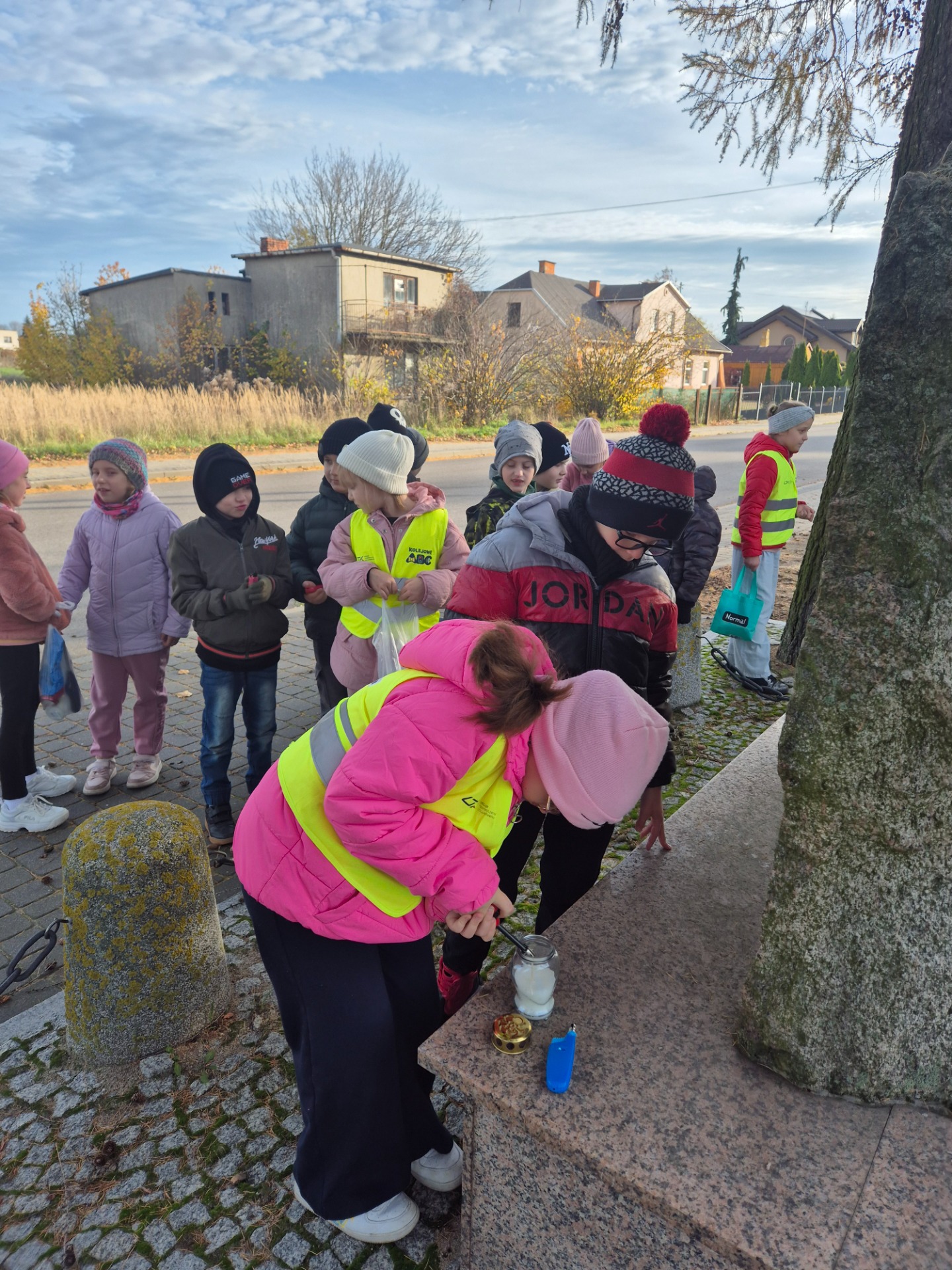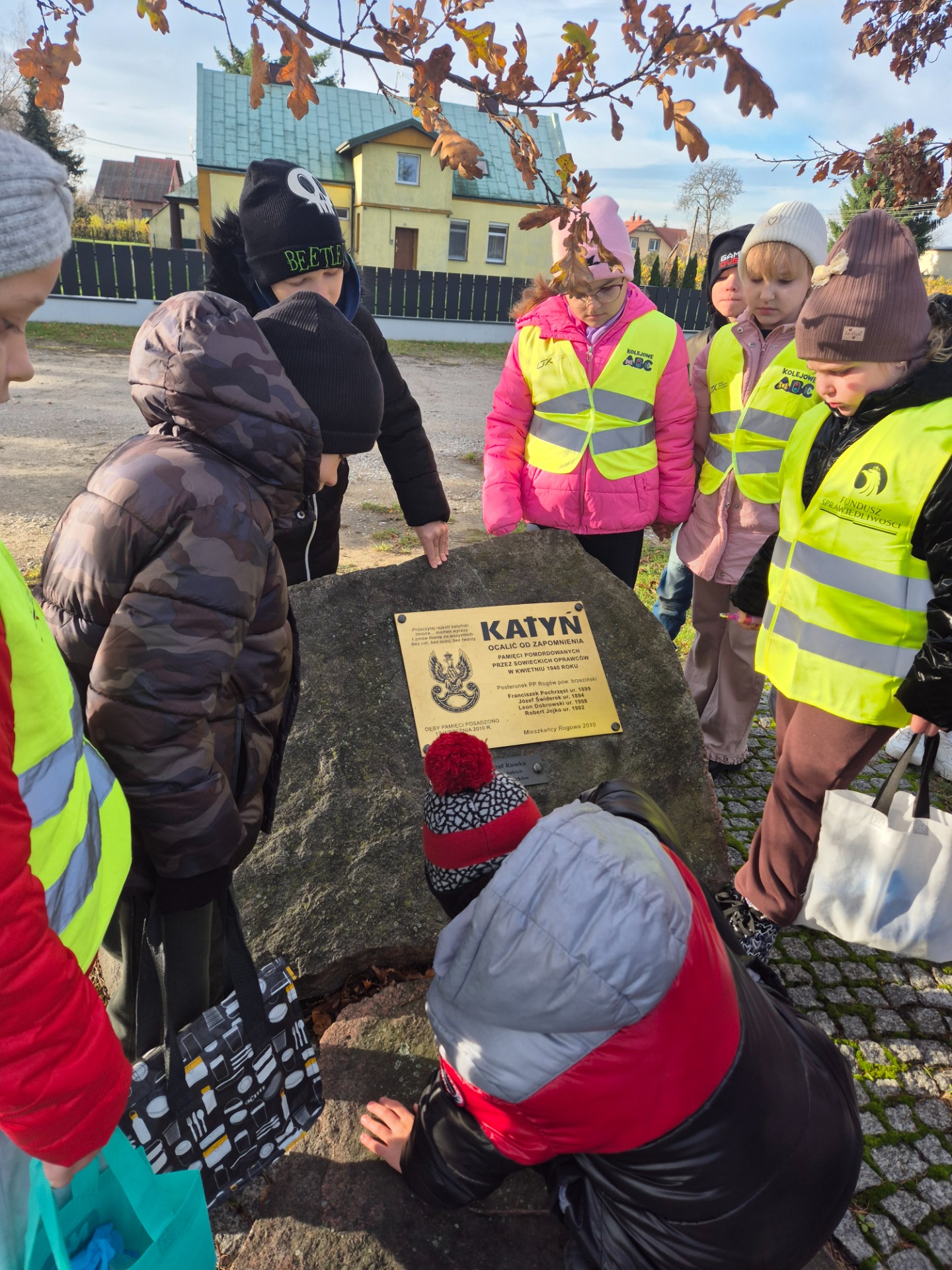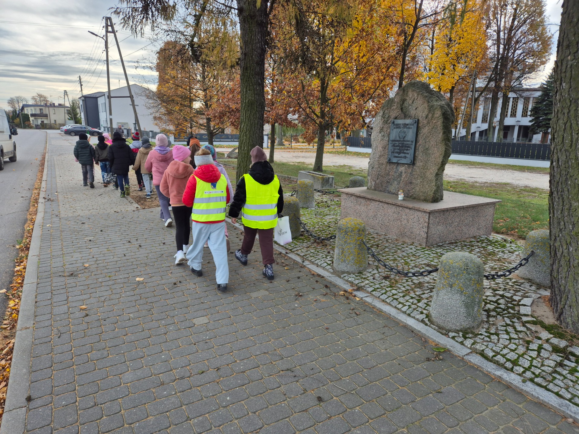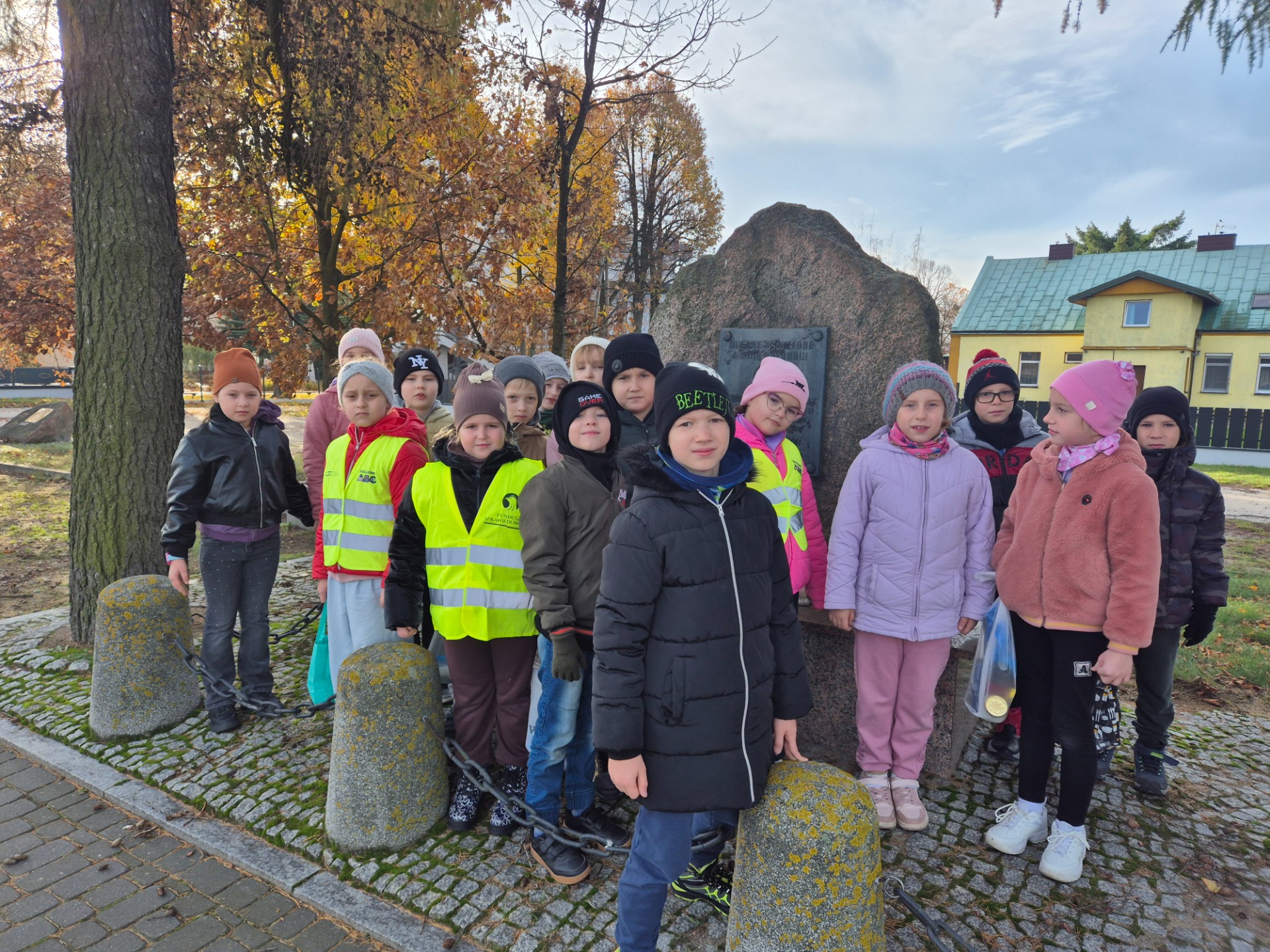 Pod koniec października uczniowie klasy II b wraz z wychowawczynią p. Lidią Popłońską udali się na krótką wycieczkę do miejsc pamięci związanych z II wojną światową, znajdujących się w Rogowie. Zatrzymali się przy pomniku poległych Rogowian, tablicy poświęconej ofiarom katyńskim oraz na cmentarzu przy grobach żołnierzy. Dzieci uporządkowały odwiedzane miejsca, zapaliły znicze i minutą ciszy uczciły pamięć zmarłych. Podczas wizyty dowiedziały się o znaczeniu tych miejsc i o tym , dlaczego należy o nie dbać. Z zainteresowaniem słuchały wiadomości historycznych, zadawały pytania. Była to dla nich ważna lekcja, która nauczyła ich postawy szacunku wobec naszych poległych za wolność rodaków.
