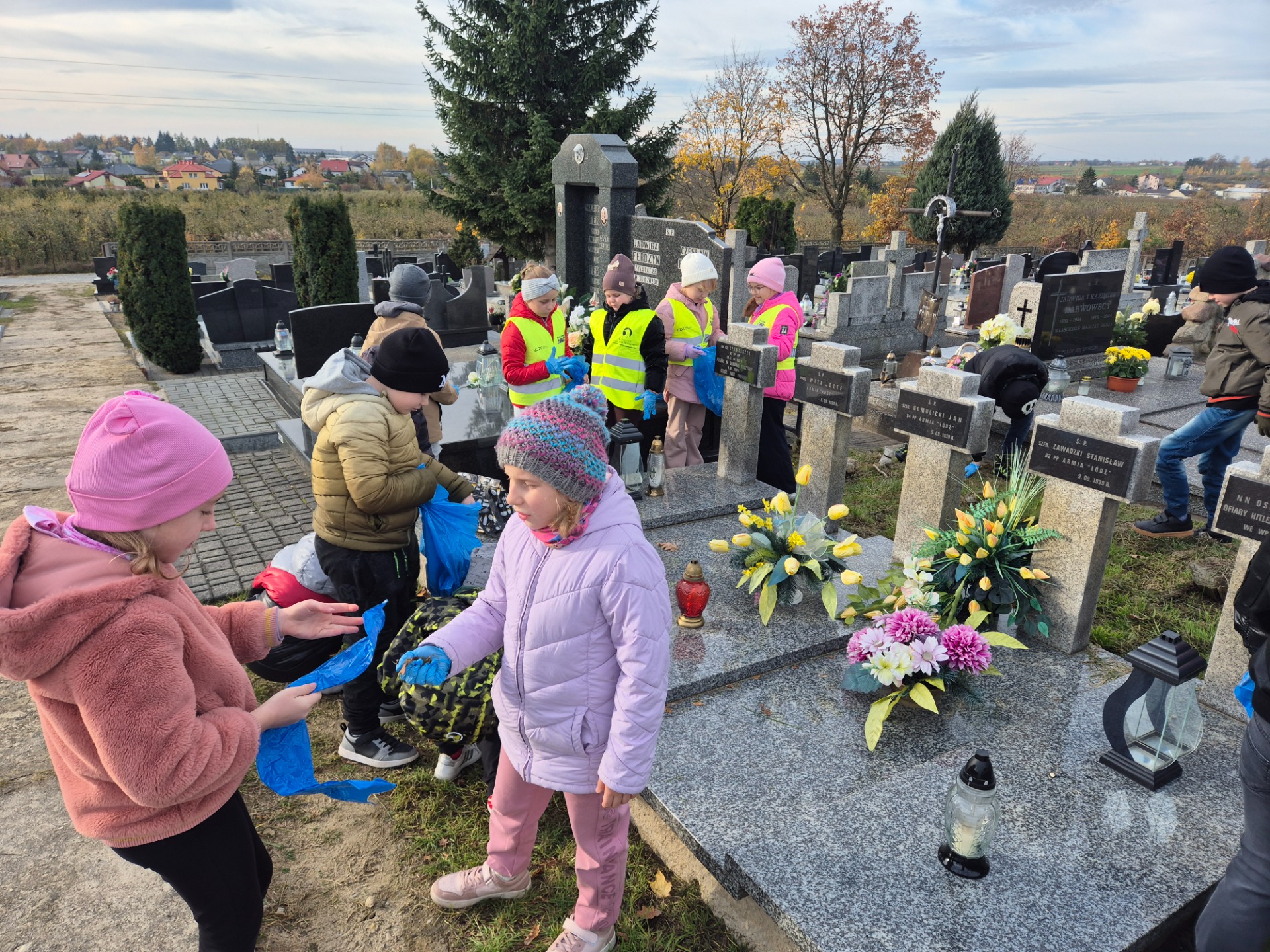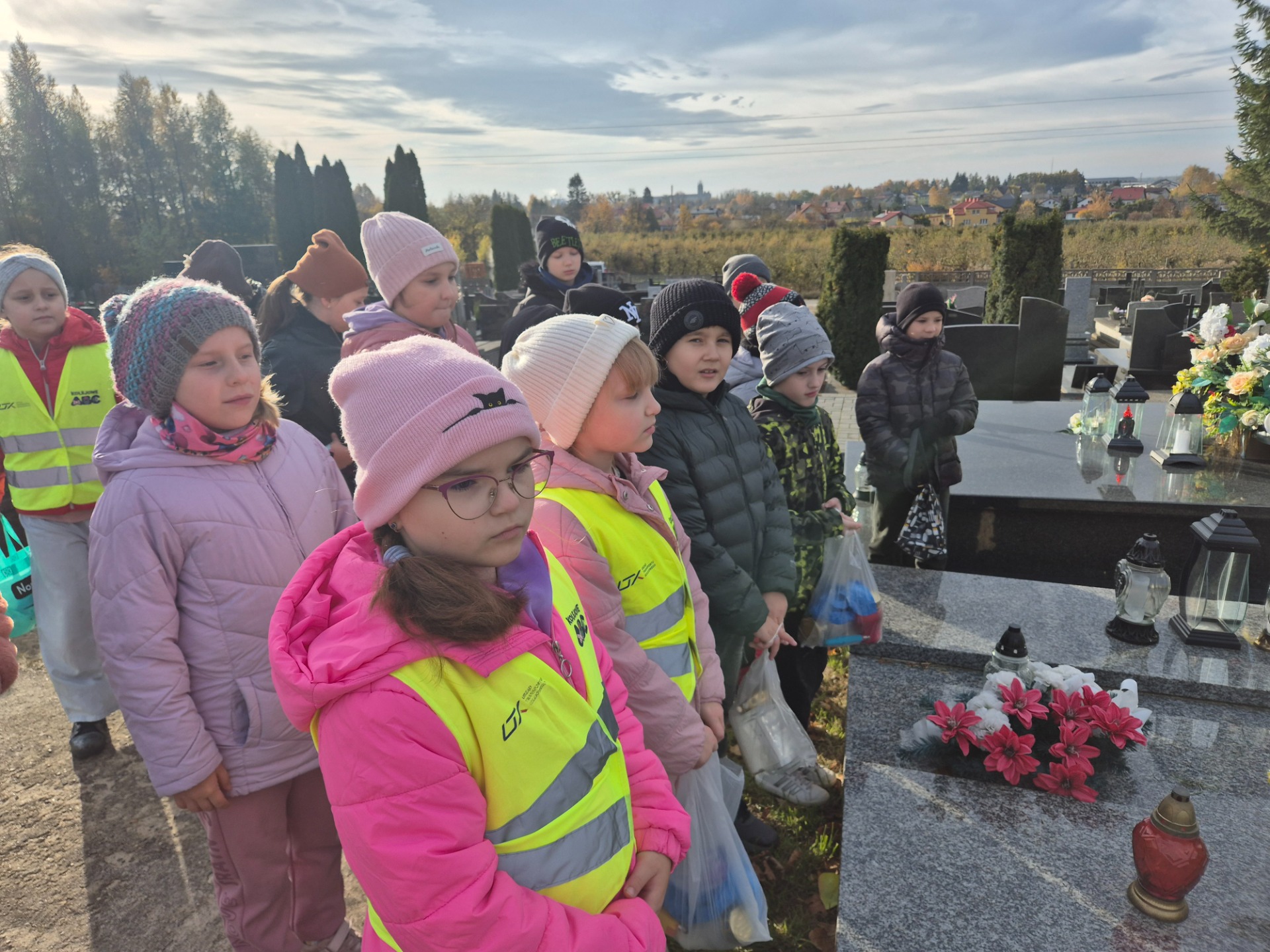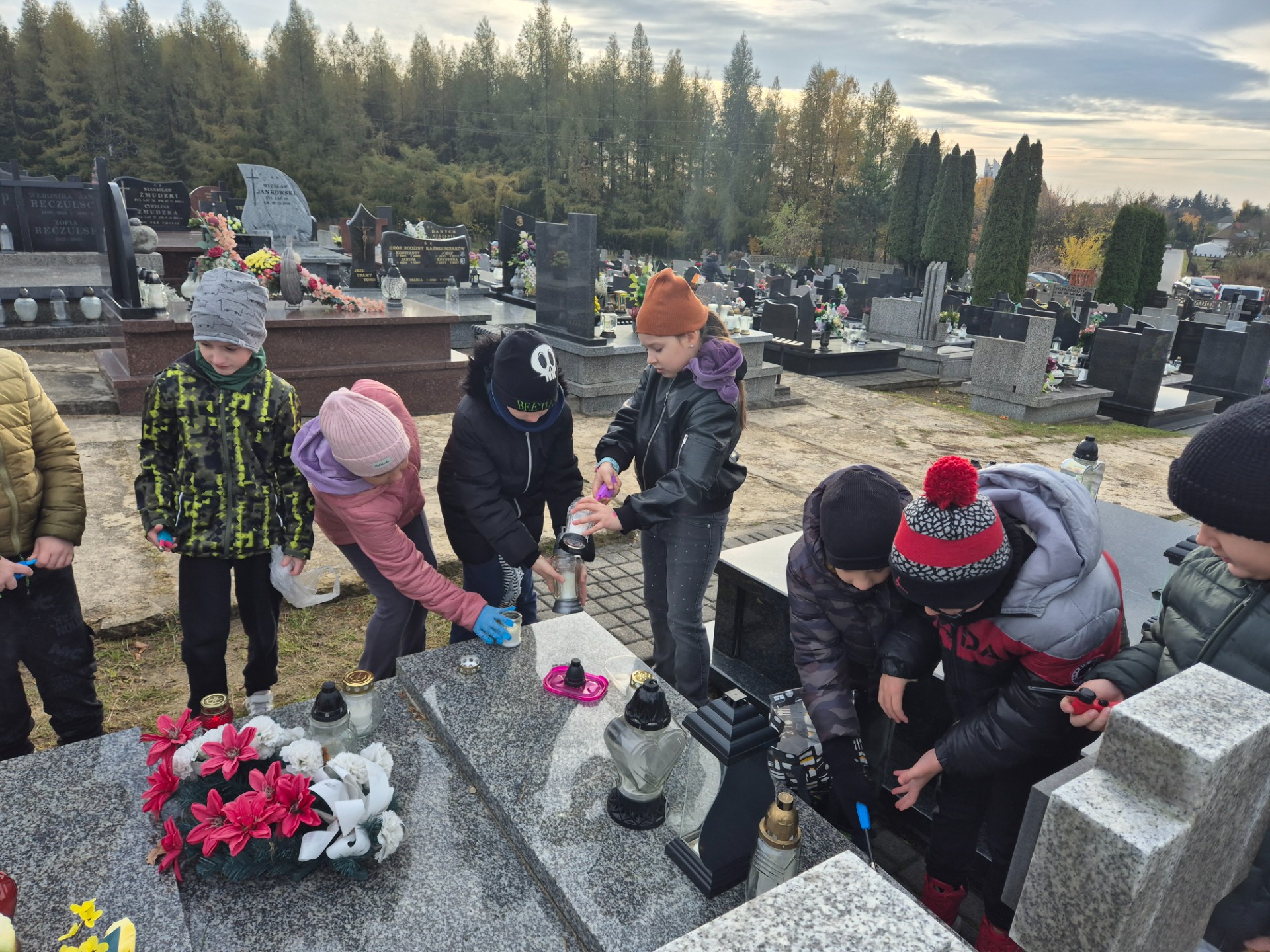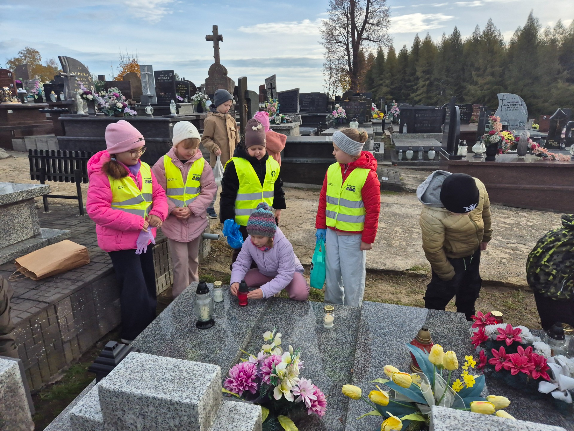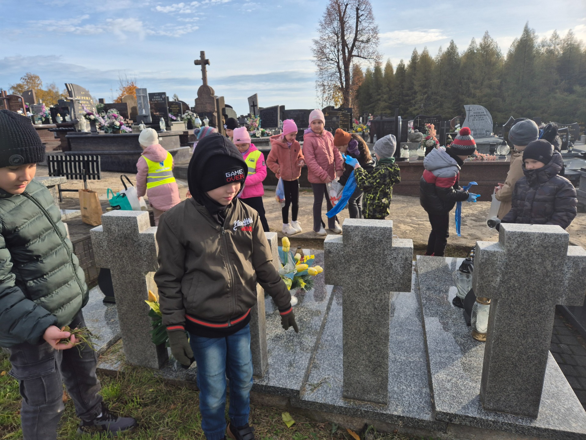 Pod koniec października uczniowie klasy II b wraz z wychowawczynią p. Lidią Popłońską udali się na krótką wycieczkę do miejsc pamięci związanych z II wojną światową, znajdujących się w Rogowie. Zatrzymali się przy pomniku poległych Rogowian, tablicy poświęconej ofiarom katyńskim oraz na cmentarzu przy grobach żołnierzy. Dzieci uporządkowały odwiedzane miejsca, zapaliły znicze i minutą ciszy uczciły pamięć zmarłych. Podczas wizyty dowiedziały się o znaczeniu tych miejsc i o tym , dlaczego należy o nie dbać. Z zainteresowaniem słuchały wiadomości historycznych, zadawały pytania. Była to dla nich ważna lekcja, która nauczyła ich postawy szacunku wobec naszych poległych za wolność rodaków.