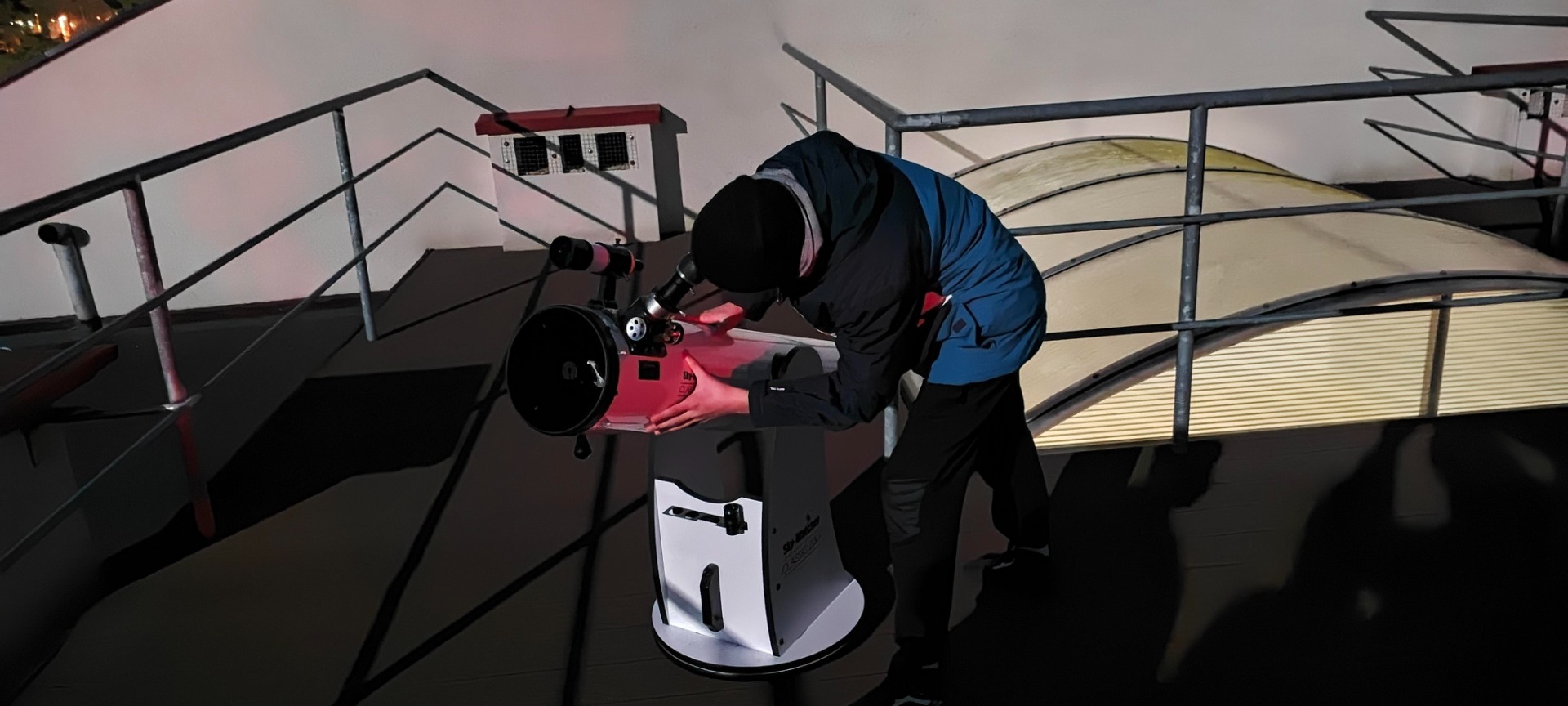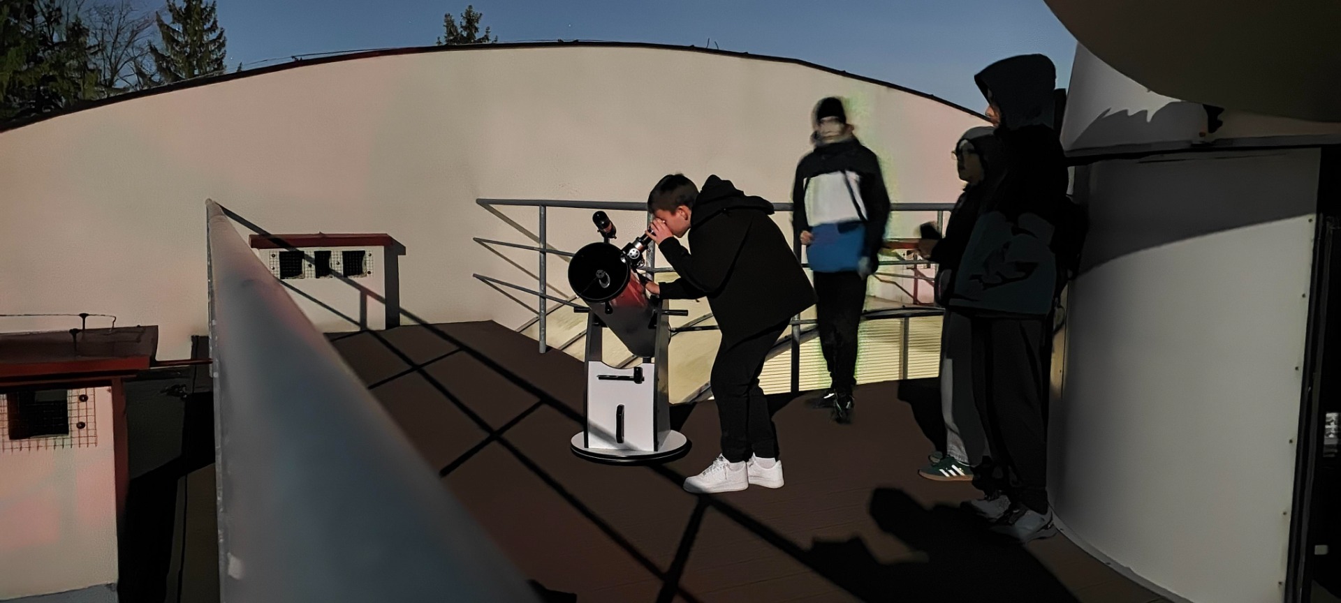6 listopada odbyło się spotkanie w naszym szkolnym obserwatorium astronomicznym z Panem Pawłem Walczakiem pasjonatem astronomii i opiekunem obserwatorium w Koluszkach. W spotkaniu brali udział uczniowie z klas 6-8. Po demonstracji teleskopów przenośnych rozpoczęliśmy obserwację nocnego nieba również naszym szkolnym teleskopem stacjonarnym. Teleskopy kierowaliśmy na „obiekty” znajdujące się najbliżej Ziemi-Księżyc, który tego dnia był dobrze widoczny. Pogodny wieczór pozwolił nam spojrzeć również na Saturna. Planeta króluje obecnie wieczorami na południowym niebie, dominując jasnością okoliczne gwiazdy. Spojrzenie przez teleskop ujawnia jej pierścienie. Na zdjęciu widać jednak coś jeszcze. Kropka po lewej stronie, tuż ponad pierścieniem to Tytan - największy księżyc Saturna. Uczniowie uczyli się samodzielnej obsługi teleskopów i wyszukiwania obiektów na nocnym niebie. Podziwialiśmy mrowie gwiazd w rejonach ramion spiralnych naszej galaktyki a nawet odszukaliśmy Galaktykę Andromedy, która nieco ginęła na rozświetlonym przez blask Księżyca, niebie nad Rogowem.
