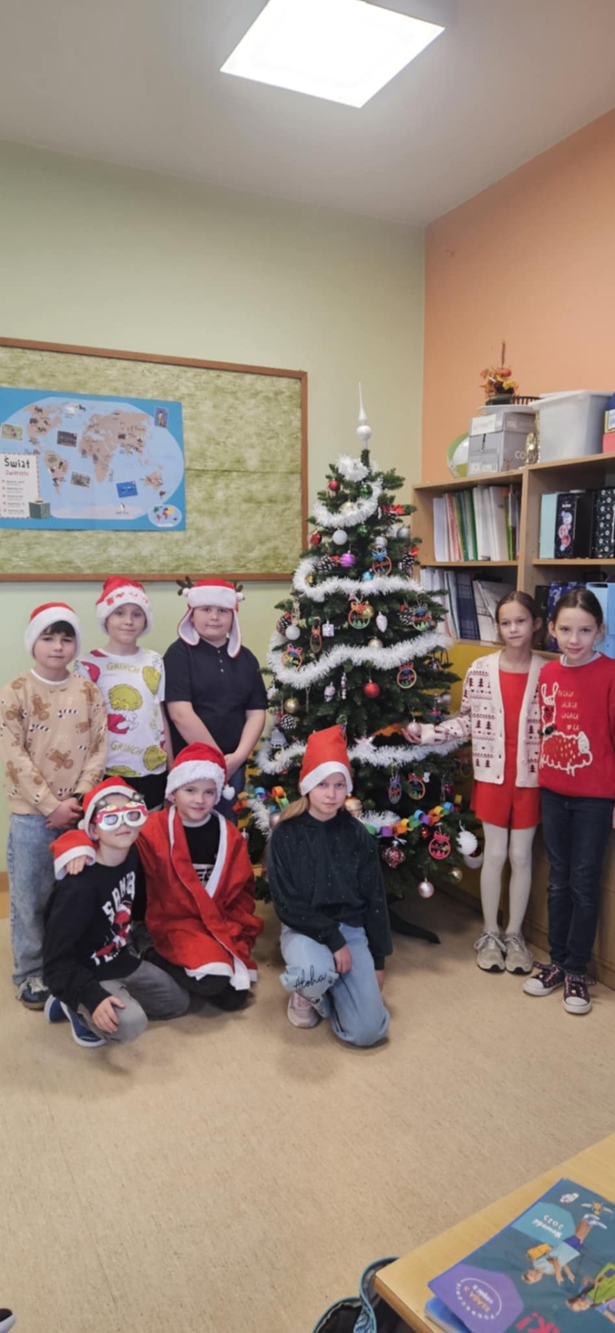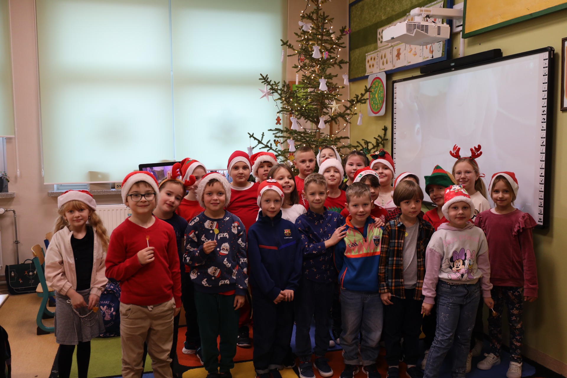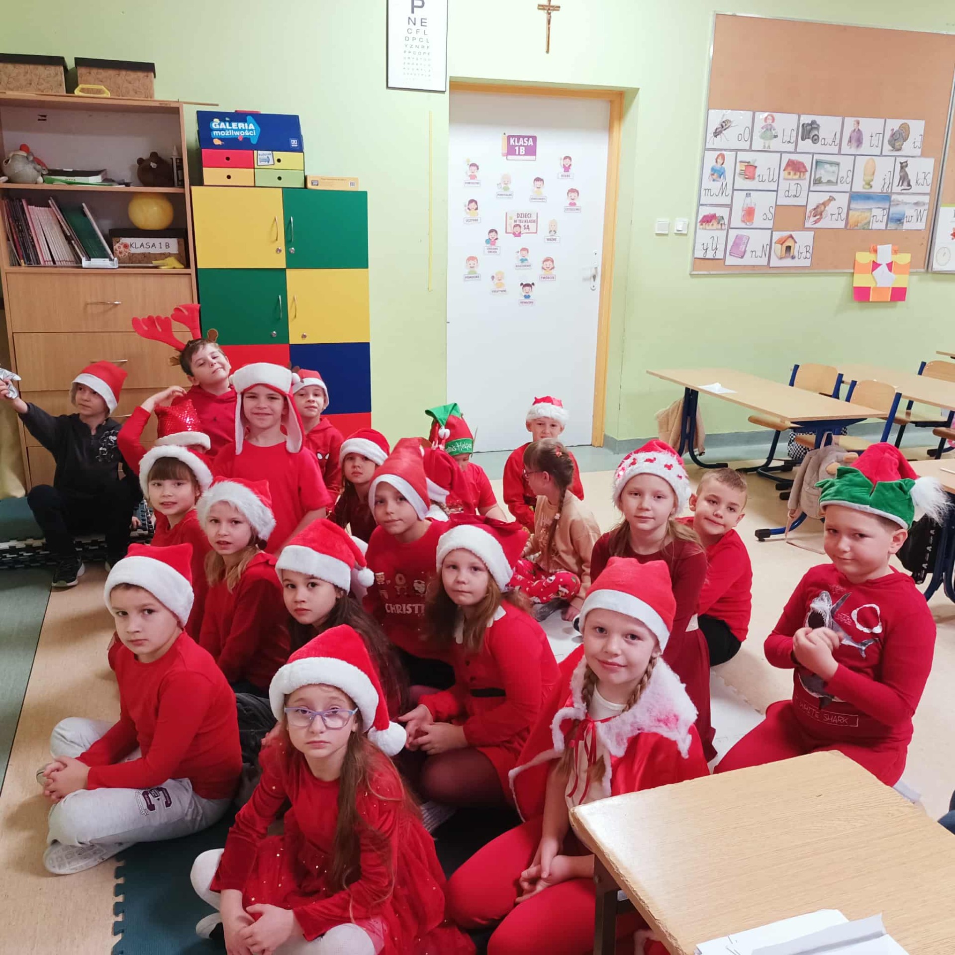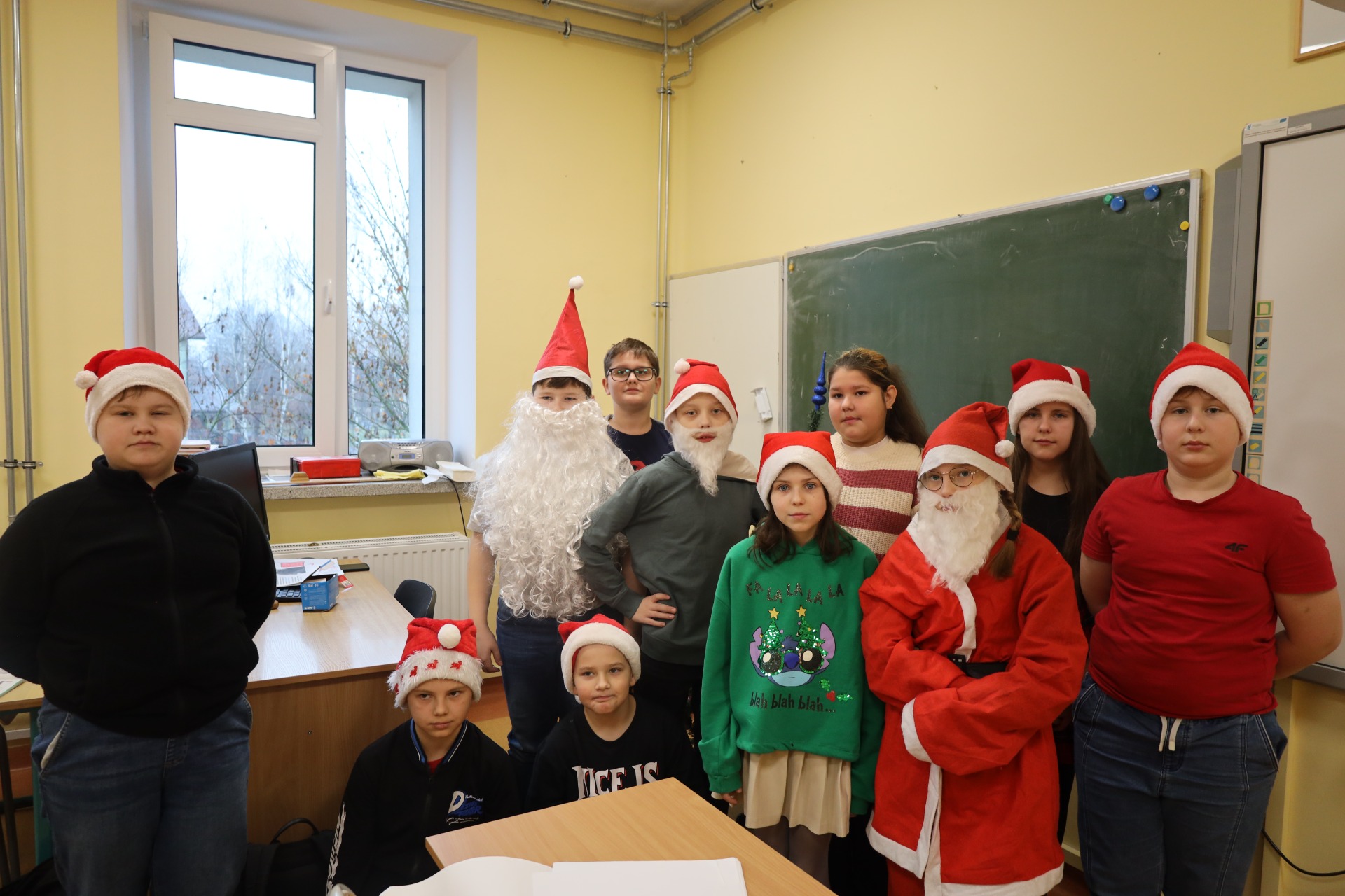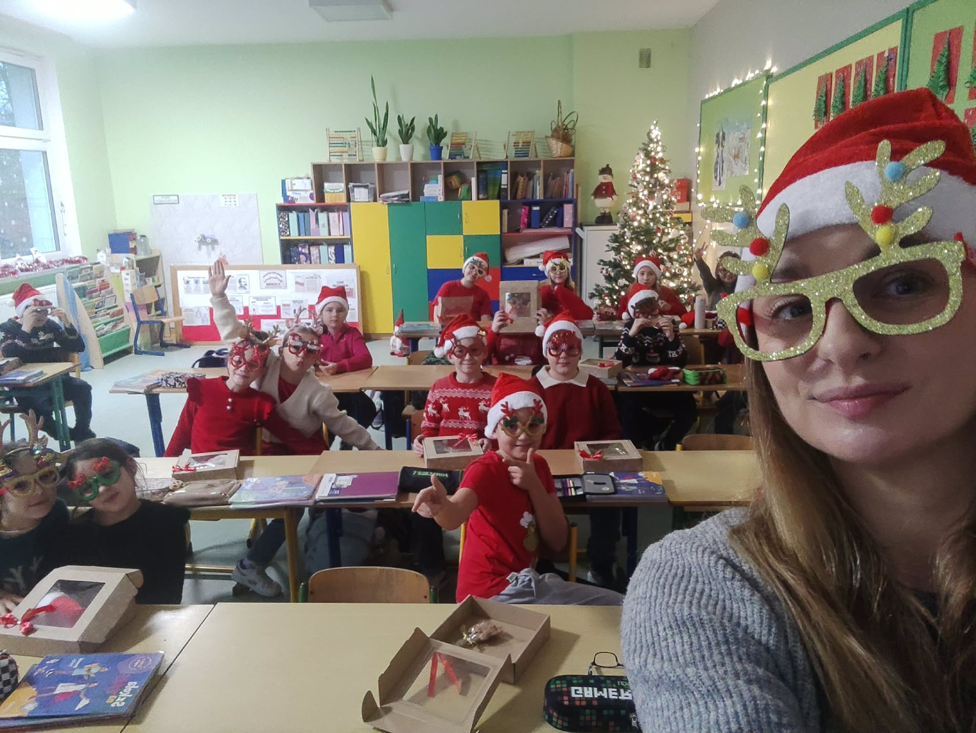 Klasa 1b rozpoczęła świętowanie od wspólnego ubierania choinki. Następnie uczniowie obejrzeli film przesłany specjalnie dla nich przez świętego Mikołaja. Kolejną atrakcją była gra Escape Room, w której dzieci, pracując w grupach, musiały rozwiązać świąteczne zagadki. Drużyna, która jako pierwsza zdobyła kod, otwierała drzwi tajemniczego pokoju. Na zakończenie na wszystkich czekały przepyszne, pachnące babeczki.
