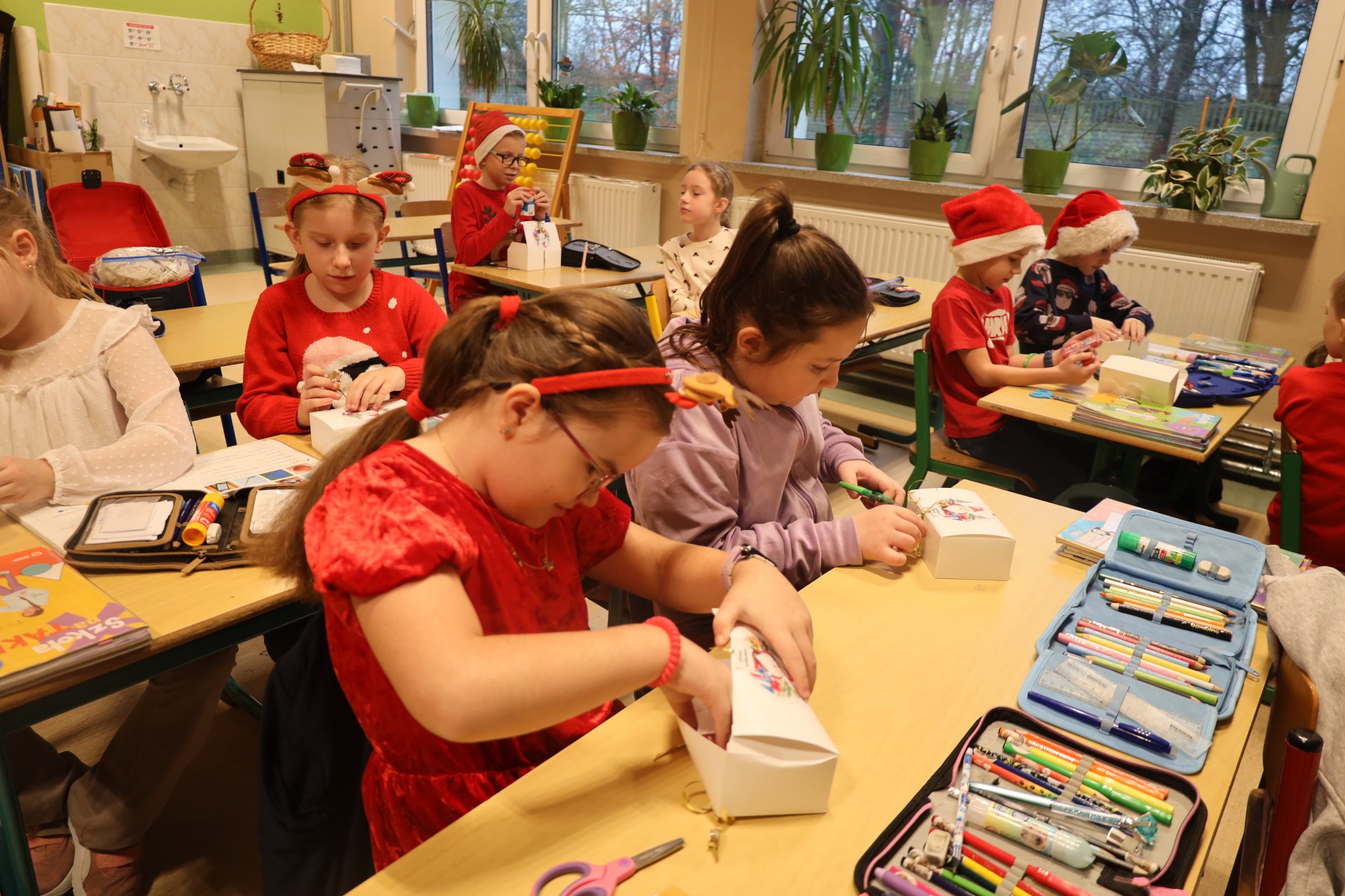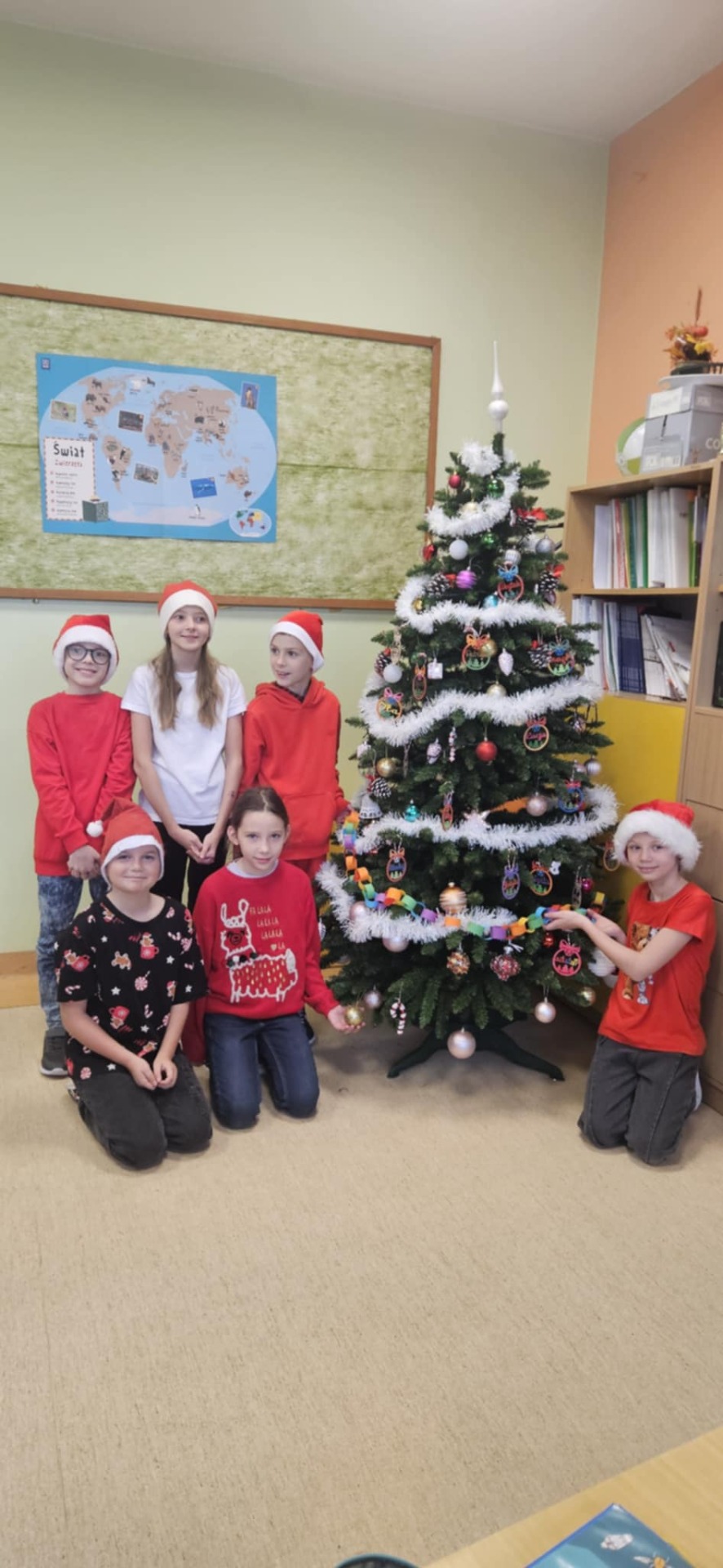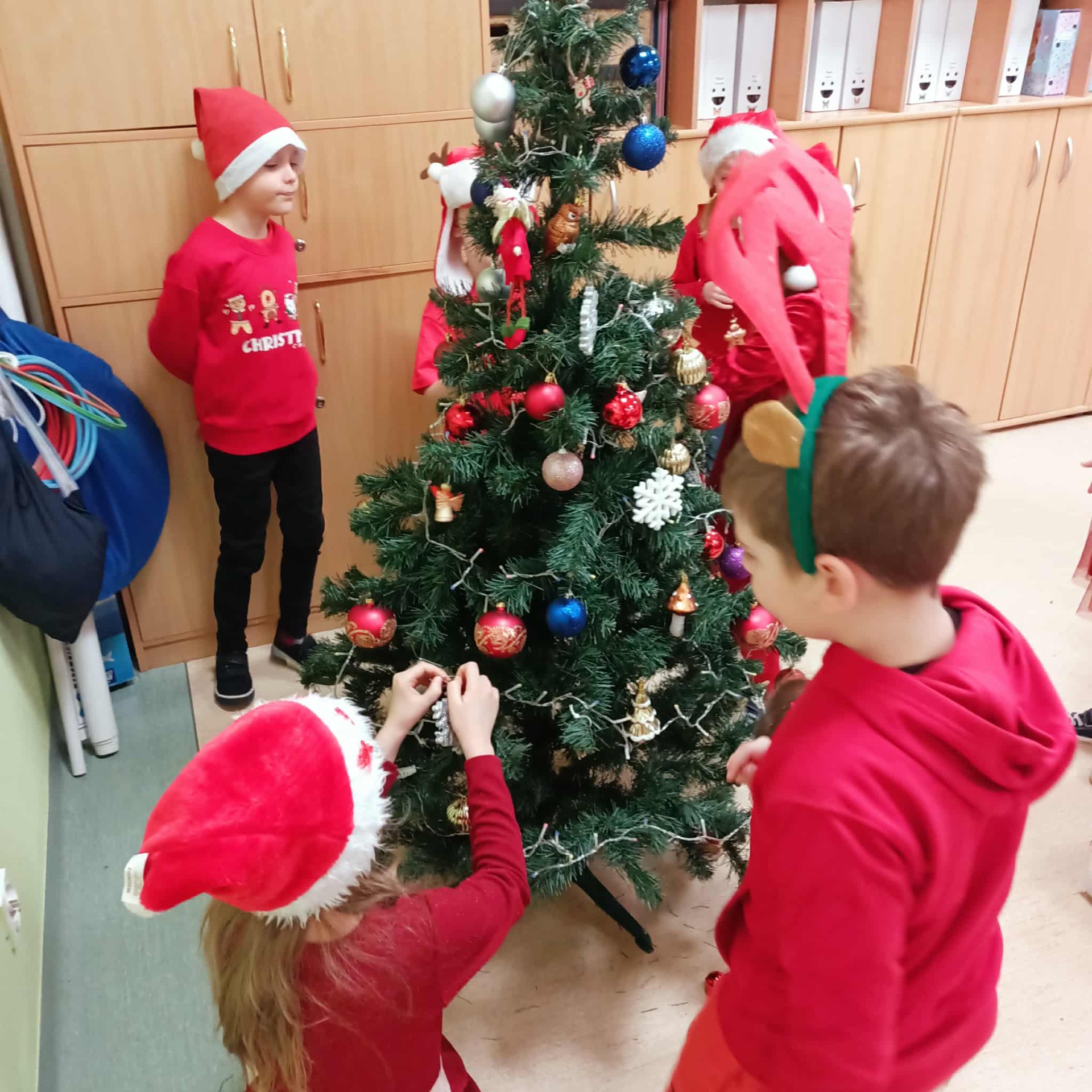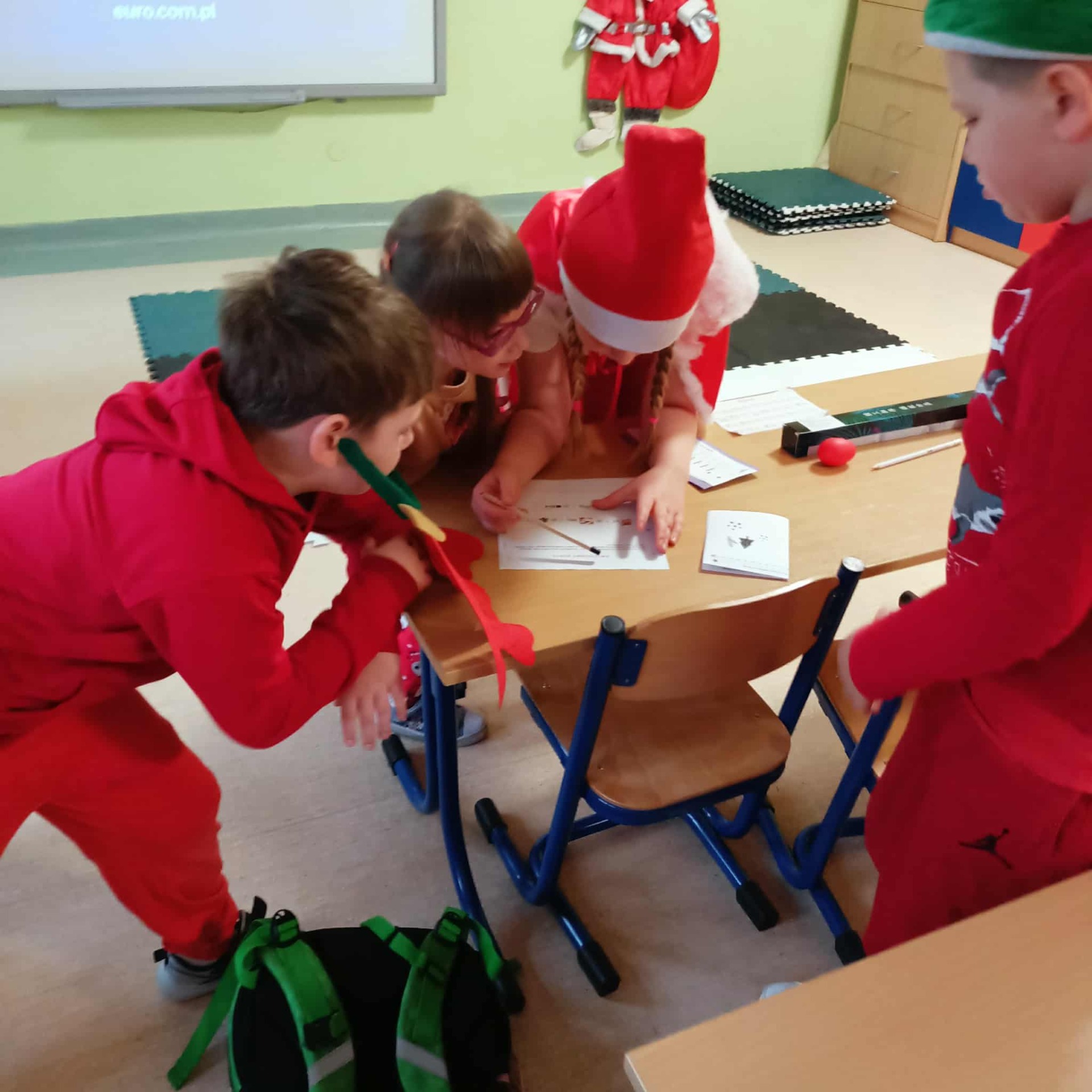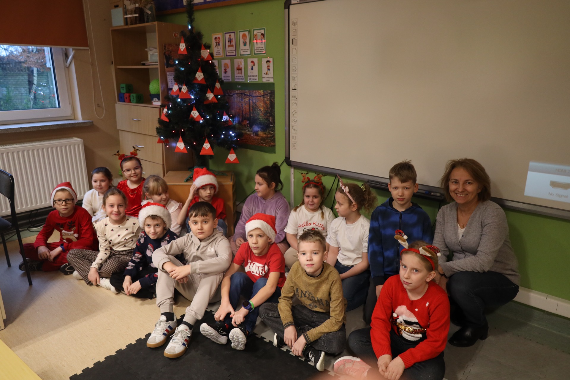 Klasa 1b rozpoczęła świętowanie od wspólnego ubierania choinki. Następnie uczniowie obejrzeli film przesłany specjalnie dla nich przez świętego Mikołaja. Kolejną atrakcją była gra Escape Room, w której dzieci, pracując w grupach, musiały rozwiązać świąteczne zagadki. Drużyna, która jako pierwsza zdobyła kod, otwierała drzwi tajemniczego pokoju. Na zakończenie na wszystkich czekały przepyszne, pachnące babeczki.